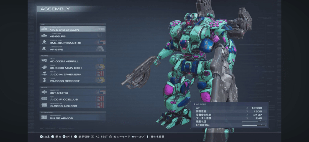 ベリルヘッドにメインディッシュコア、エフェメラ腕、デザート足の構成で、重量級の防御力を保ちながら、軽量化出来ており、